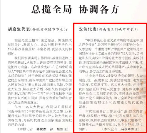 編者按3月8日,《人民日報》“兩會特刊”以《實現(xiàn)偉大復(fù)興靠黨把好方向盤》為題推出特別報道,在這組報道中,該報刊發(fā)了全國人大代表、三門峽市市長安偉參加十三屆全國人大一次會議審議時的發(fā)言摘要,F(xiàn)予轉(zhuǎn)發(fā)。