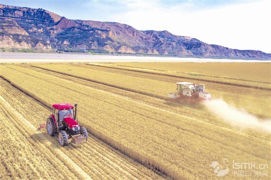 ![]() 6月5日,在黃河岸邊靈寶市西閻鄉(xiāng)項生農(nóng)業(yè)機械服務(wù)專業(yè)合作社,收割機正在收割小麥(無人機照片)。