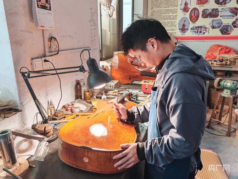 制琴師正在工作(央廣網(wǎng)記者 張羲輪 攝) 確山提琴產(chǎn)業(yè)的起步源于20世紀(jì)90年代,起初只是一些鄉(xiāng)村作坊。2015年,“歡迎闖天下的確山人回老家”的號召吹響產(chǎn)業(yè)振興的集結(jié)號。返鄉(xiāng)創(chuàng)業(yè)的提琴匠人們不僅帶回了手藝和資金,也帶來了市場理念和品牌意識。 確山縣手工提琴制作協(xié)會會長王金堂見證了家鄉(xiāng)提琴產(chǎn)業(yè)從無到有、從弱到強(qiáng)的全過程。2015年,他率先返鄉(xiāng)創(chuàng)立河南省金鳴樂器股份有限公司,并帶領(lǐng)一批制琴師回到確山創(chuàng)業(yè)。他們通過改進(jìn)工藝、研發(fā)新品,將確山提琴打造成國際高端市場的寵兒。王金堂介紹,他的一把定制手工提琴曾以20萬美元的價格賣出。 據(jù)王金堂介紹,確山縣現(xiàn)有提琴企業(yè)144家,僅竹溝鎮(zhèn)就有提琴作坊122家,可生產(chǎn)的提琴相關(guān)產(chǎn)品包括小提琴、中提琴、大提琴、貝斯及相關(guān)配件等超過30個系列,產(chǎn)量占全國提琴總量的40%左右,在中高檔手工提琴上更是占據(jù)了80%以上的市場份額,產(chǎn)品遠(yuǎn)銷海外,年產(chǎn)提琴40萬把,年產(chǎn)值6億多元,帶動了近3000人在家門口就業(yè)。