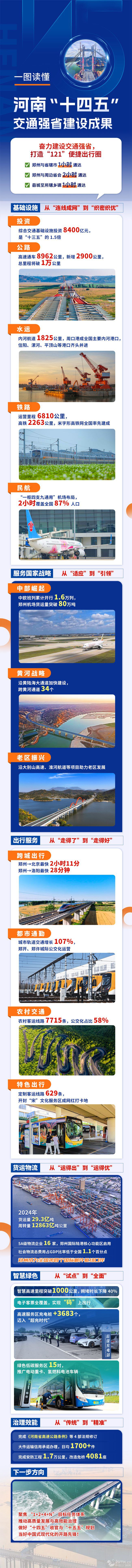 | 人民網(wǎng)鄭州10月14日電 (程明輝)跨城出行“拎包走”、都市通勤“像串門”、個(gè)性出行“特色足”……10月13日,河南省舉行“十四五”系列主題新聞發(fā)布會(huì),會(huì)上披露,“十四五”以來,河南交通強(qiáng)省建設(shè)邁出堅(jiān)實(shí)步伐,一個(gè)更高效、更智能、更暖心的中原綜合立體交通網(wǎng)正逐步成型。 “鄭州與省轄市1小時(shí)通達(dá)、鄭州與周邊省會(huì)城市2小時(shí)通達(dá)、縣城至所轄鄉(xiāng)鎮(zhèn)1小時(shí)通達(dá),全省‘121’便捷出行格局基本形成。”河南省交通運(yùn)輸廳黨組書記、廳長付磊介紹,“十四五”期間,河南綜合交通基礎(chǔ)設(shè)施投資將達(dá)8400億元,是“十三五”的1.5倍,全省綜合交通網(wǎng)總規(guī)模達(dá)29.2萬公里。 公路方面,高速公路通車?yán)锍桃堰_(dá)8962公里,“十四五”新增里程超2900公里,年底將突破1萬公里,90%以上的縣邁入“雙高速”時(shí)代。普通干線公路新改建4500公里,實(shí)現(xiàn)重要節(jié)點(diǎn)二級(jí)及以上公路連通。農(nóng)村公路也成績斐然,新改建4萬公里,“四好農(nóng)村路”全國示范縣達(dá)23個(gè)。 水運(yùn)方面,河南內(nèi)河航道里程達(dá)1825公里,周口港成為全國內(nèi)河主要港口之一,2024年全省完成港口吞吐量6085萬噸、集裝箱10.9萬標(biāo)箱,比“十三五”末分別增長1倍、12倍。 鐵路民航同樣蓬勃發(fā)展,鐵路運(yùn)營里程達(dá)6810公里,其中高速鐵路2263公里,率先建成“米”字形高鐵網(wǎng)。全省形成“一樞四支九通用”機(jī)場布局,航空運(yùn)輸2小時(shí)內(nèi)覆蓋全國87%以上人口。 在服務(wù)重大戰(zhàn)略方面,河南積極作為。“鄭州-盧森堡”“鄭州-吉隆坡”雙樞紐發(fā)力,中歐班列(鄭州)累計(jì)開行16000列,鄭州航空港區(qū)建成內(nèi)陸首個(gè)國際公路運(yùn)輸集結(jié)中心。同時(shí),沿黃陸海大通道加快建設(shè),跨黃河運(yùn)輸通道達(dá)34個(gè),沿大別山高速等項(xiàng)目建成通車,為老區(qū)發(fā)展注入新動(dòng)能。 便捷群眾出行也是河南交通發(fā)展的重點(diǎn)?绯浅鲂“拎包走”,鄭州到北京最快2小時(shí)11分,到洛陽高鐵28分鐘直達(dá)。都市通勤“像串門”,城市軌道交通運(yùn)營里程增加220公里,鄭開、鄭許城際公交化運(yùn)營,通勤成本降低近一半。農(nóng)村交通“有保障”,開通農(nóng)村客運(yùn)線路7715條,公交化運(yùn)營占比58%。此外,全省新增定制客運(yùn)線路629條,“交通+醫(yī)療”等特色服務(wù)不斷創(chuàng)新。 在貨物運(yùn)輸方面,河南正由“內(nèi)陸腹地”向“物流樞紐”加速轉(zhuǎn)變。2024年全省累計(jì)完成貨運(yùn)量29.3億噸、貨運(yùn)周轉(zhuǎn)量12863億噸公里,比“十三五”末分別增長34%、48%。郵政快遞也進(jìn)階提質(zhì),2024年完成郵政行業(yè)業(yè)務(wù)收入727.3億元、快遞業(yè)務(wù)量90.5億件,比“十三五”末分別增長79%、192%。 智慧綠色發(fā)展同樣亮點(diǎn)紛呈。智慧高速里程突破1000公里,智慧擴(kuò)容試點(diǎn)路段改造后擁堵總時(shí)長有望下降40%。綠色交通方面,城市公交基本實(shí)現(xiàn)新能源化,全省高速公路服務(wù)區(qū)新增充電樁3683個(gè),邁入“超充時(shí)代”。 一圖讀懂河南“十四五”交通強(qiáng)省建設(shè)成果