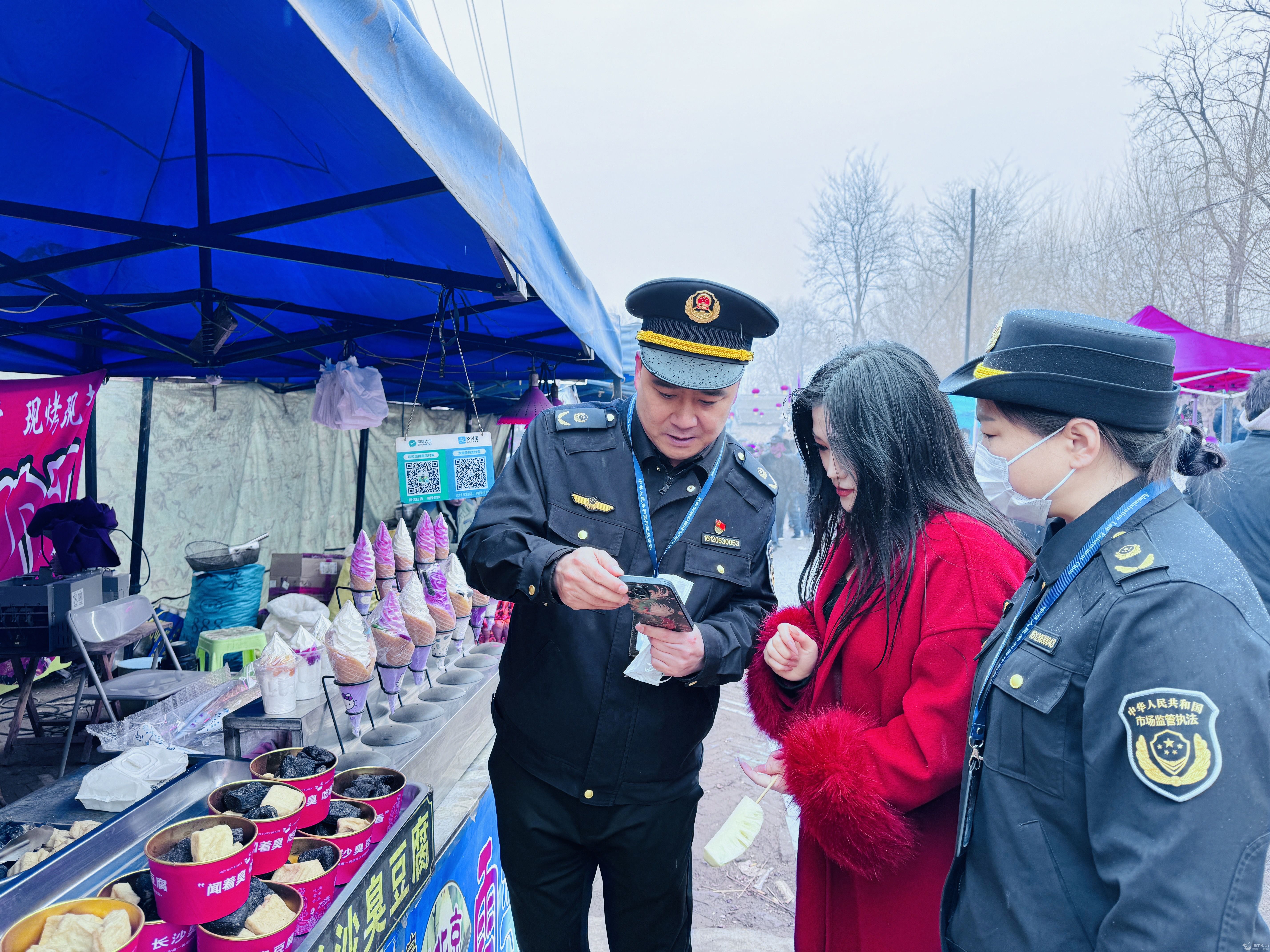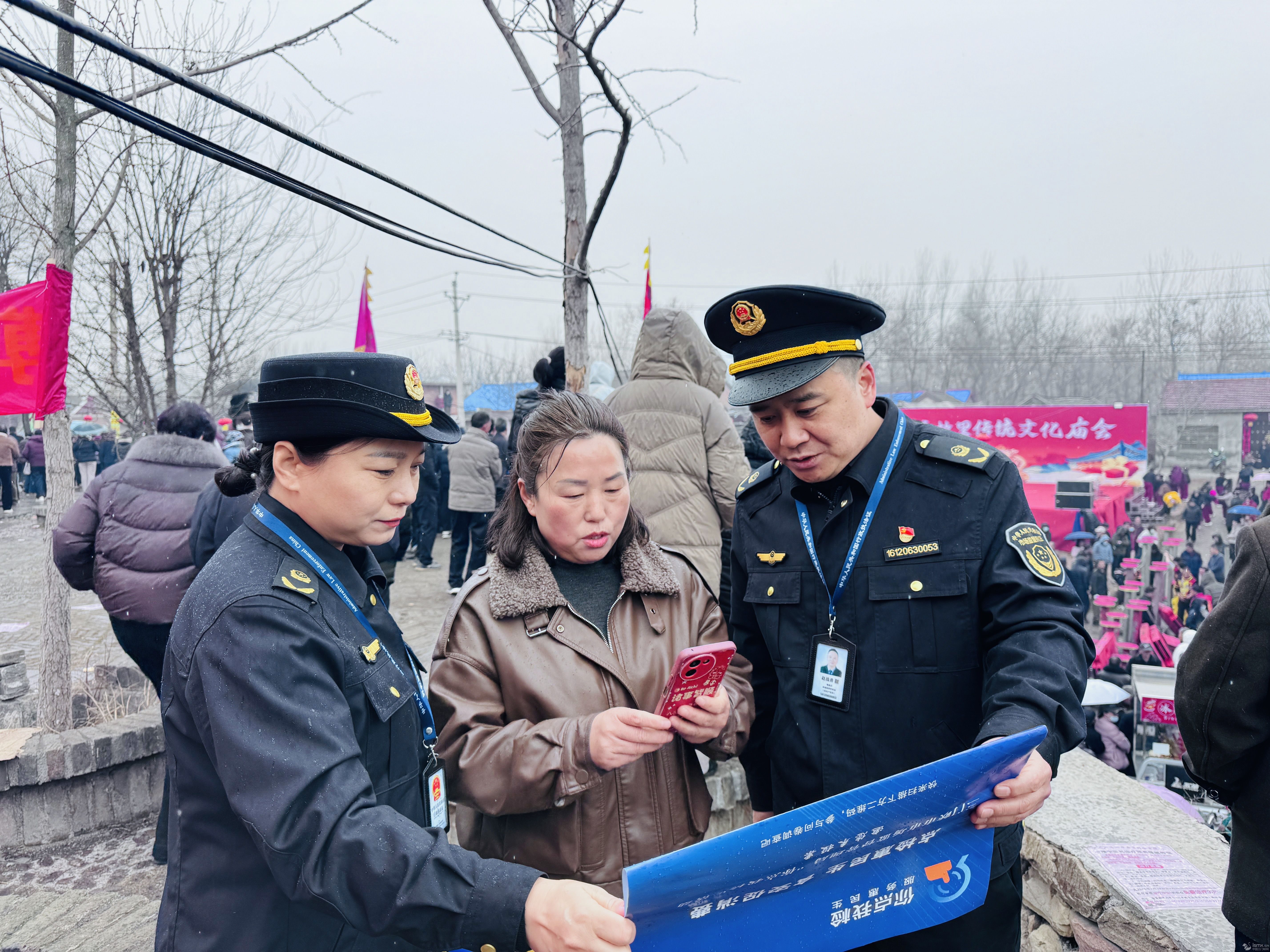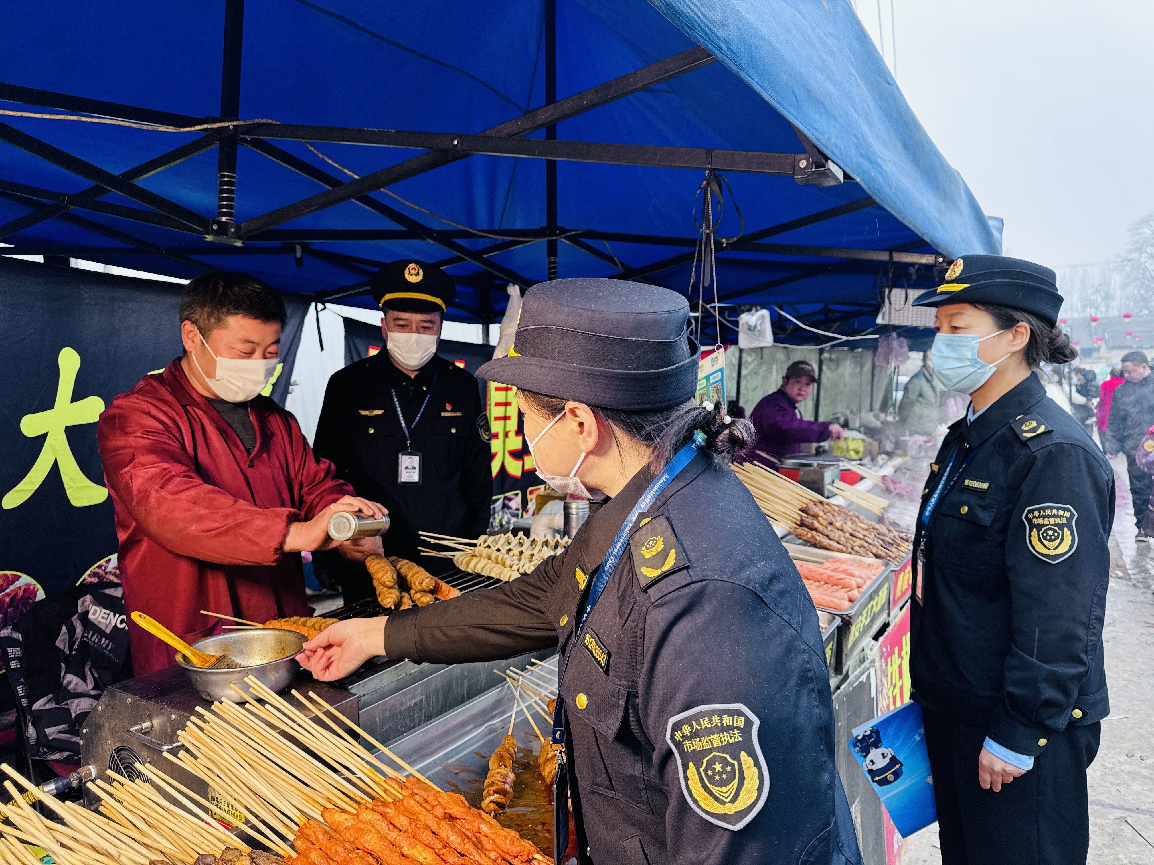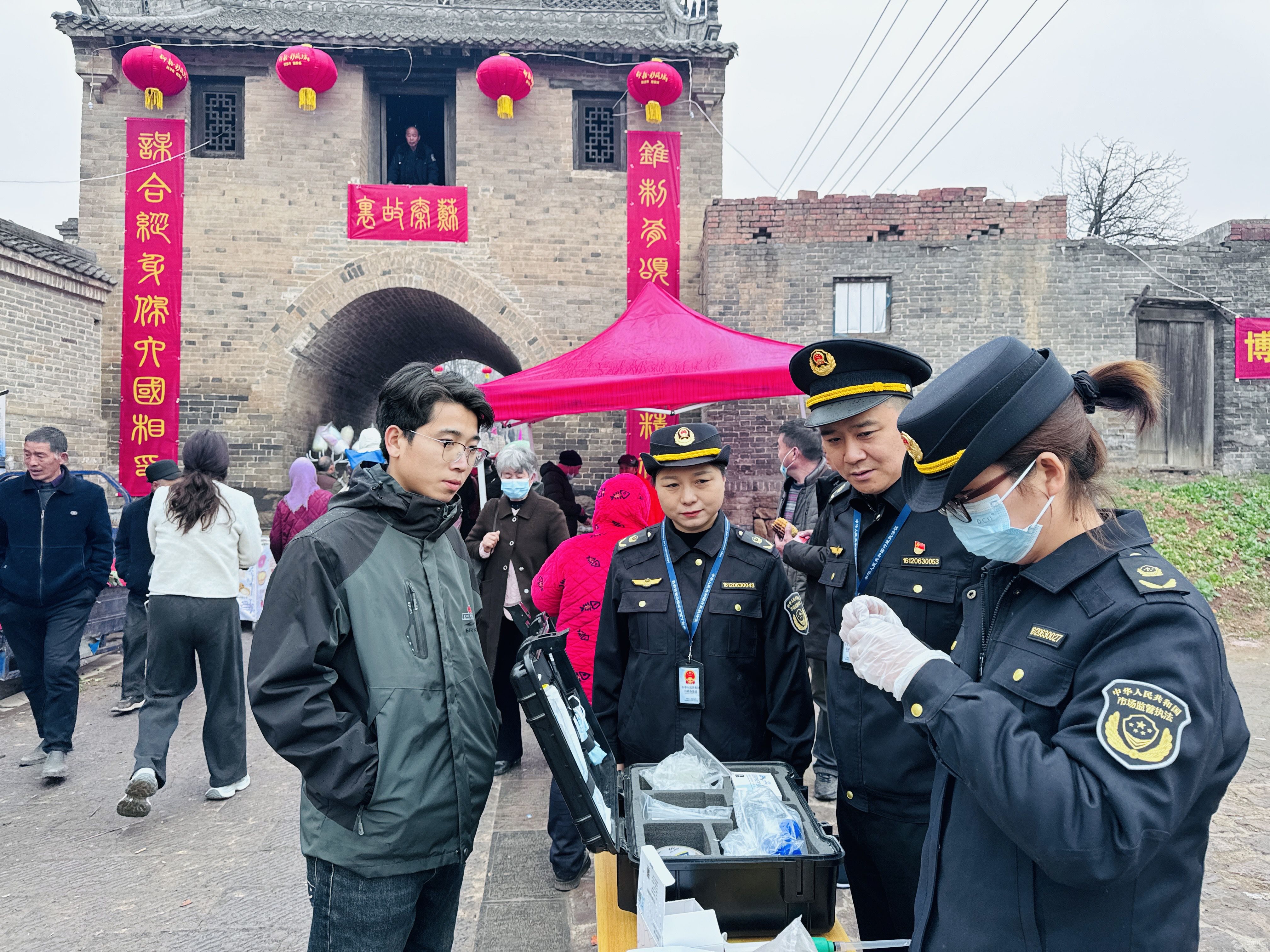 逛廟會、品美食,是鄉(xiāng)村老百姓生活中的一件大事。廟會人員流動大、流動攤販多、經(jīng)營業(yè)態(tài)雜,食品安全隱患也會隨之增多。河南省澠池縣市場監(jiān)管局因地制宜,將“你送我檢”活動、食品安全監(jiān)管觸角延伸至廟會流動食品攤販,讓老百姓“零距離”感受并參與到快檢活動中來,為熱鬧非凡的廟會增添一份食品安全保障。圖為3月13日,澠池縣張村鎮(zhèn)蘇秦村廟會現(xiàn)場,執(zhí)法人員正在開展食品安全知識宣傳和“你送我檢”活動。(梁小衛(wèi))